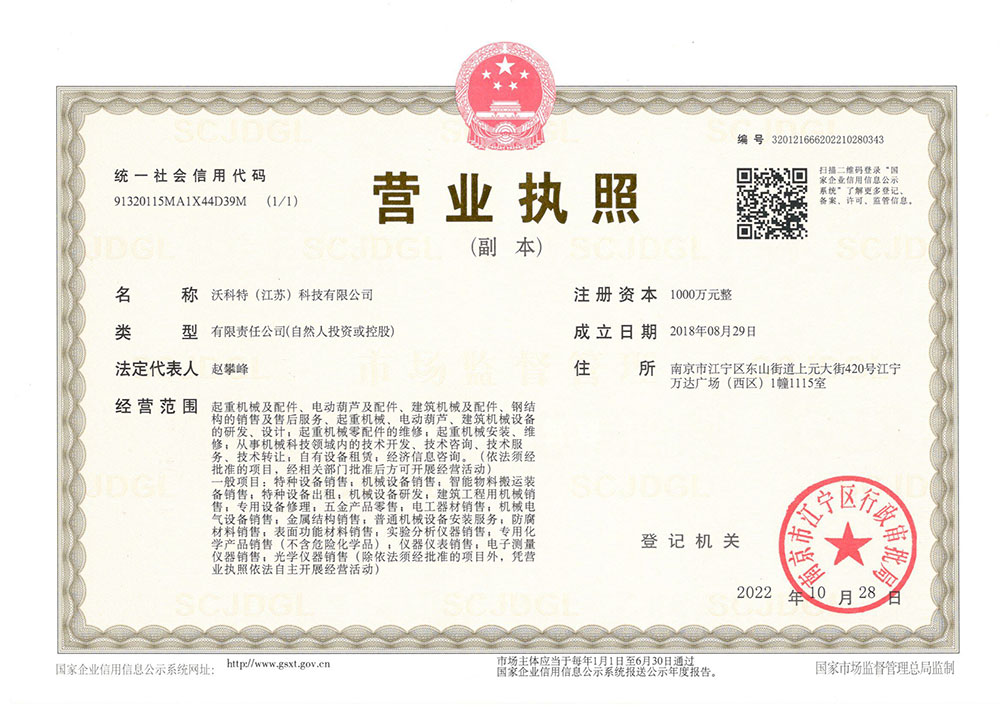 沃科特(江蘇)科技有限公司主要從事:橋式起重機、門式起重機、歐式起重機、工程起重機、小型起重機械、電動平車、電動葫蘆、電動葫蘆配件、門式起重配件、電動單梁起重機配件、雙梁橋式起重機配件、升降搬運設(shè)備、KBK柔性起重機、架橋機、提梁機、懸臂吊等起重設(shè)備的市場銷售、安裝改造、維修維保相關(guān)服務(wù)。