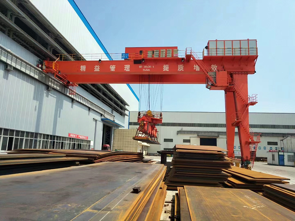 ③造船龍門起重機(jī):用于船臺(tái)拼裝船體,常備有兩臺(tái)起重小車:一臺(tái)有兩個(gè)主鉤,在橋架上翼緣的軌道上運(yùn)行;另一臺(tái)有一個(gè)主鉤和一個(gè)副鉤,在橋架下翼緣的軌道上運(yùn)行,以便翻轉(zhuǎn)和吊裝大型的船體分段。起重量一般為100~1500噸;跨度達(dá)185米;起升速度為 2~15米/分,還有0.1~0.5米/分的微動(dòng)速度。